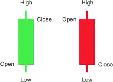 Every candlestick represents certain time frame (like one day), and their color represents the direction. White or green candlesticks are a sign that the price goes up while black or red color stands for downward direction.